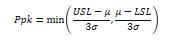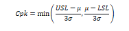 - Cpk:过程能力指数,评估短期过程能力,假设过程稳定(无特殊变异)。它考虑过程均值偏移和短期标准差(within-subgroup σ),用于预测潜在性能。计算: