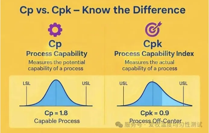 - Cpk的应用:用于短期TUS数据,评估稳定过程的潜在能力。例如,在控制图数据中计算温度偏差的Cpk>1.33表示炉子短期内能符合均匀性公差。但忽略长期变异,如炉子老化或批次差异。